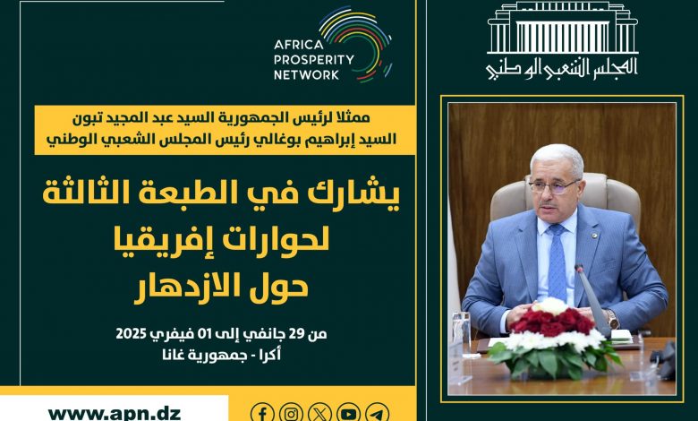 Le président de l’Assemblée populaire nationale (APN), M. Brahim Boughali, participe, en qualité de représentant du président de la République, M. Abdelmadjid Tebboune, à la 3e édition des Dialogues sur la prospérité en Afrique, prévue à Accra (Ghana).
