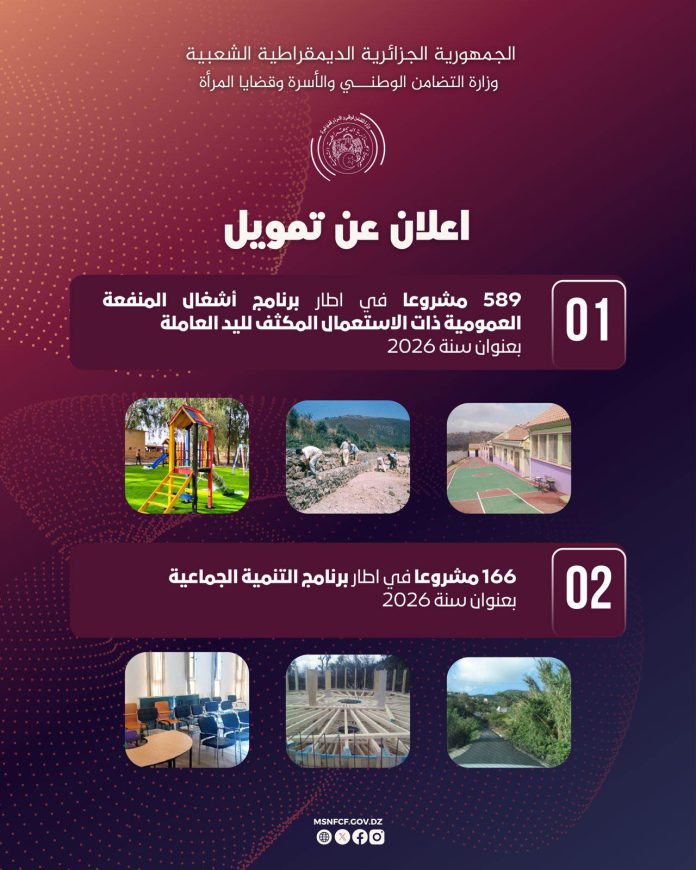 Dans le cadre de la mise en œuvre du programme du président de la République, Abdelmadjid Tebboune, notamment dans son volet relatif au renforcement des mécanismes de soutien et de solidarité, le ministère, sous la supervision de la ministre Soraya Mouloudji, a précisé que 589 projets seront lancés à travers l’Agence de développement social (ADS). Ces projets, relevant du programme des travaux publics à utilité publique et à forte intensité de main-d’œuvre, permettront la création de 5.890 emplois temporaires. Les bénéficiaires, ainsi que leurs ayants droit, bénéficieront d’une couverture sociale garantie pendant une année complète, précise la même source. Dans ce cadre, les petits entrepreneurs et artisans souhaitant participer à ces projets sont invités à se rapprocher des services de l’ADS au niveau des directions de l’action sociale et de la solidarité dans les différentes wilayas.