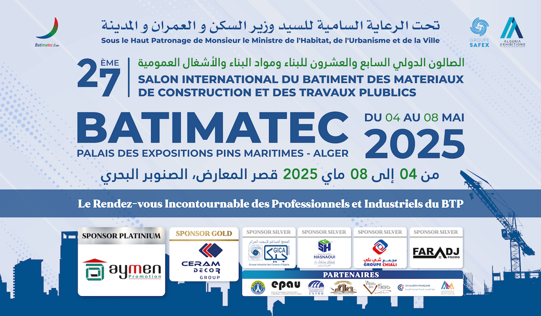 La 27e édition du Salon international du bâtiment, des matériaux de construction et des travaux publics « Batimatec », se tiendra du 4 au 8 mai en cours, au Palais des expositions à Alger, ont indiqué les organisateurs dans un communiqué. S’étalant sur une surface d’exposition de 40.000 m², cette nouvelle édition sera marquée par la participation d’un nombre « important » de sociétés nationales, publiques et privées, et de sociétés étrangères représentant une quinzaine de pays, dont la Chine, la Turquie, l’Italie, le Portugal, et l’Espagne, précise la même source. Co-organisé par la société Algeria exhibitions (filiale du groupe Safex) et la société Batimatec Expo, cet évènement offre, en plus des surfaces d’exposition et de démonstrations professionnelles, « un espace de réflexion et de débat, à travers un riche programme de conférences techniques, très prisées par les professionnels et les universitaires ». Les conférences porteront lors de cette édition sur les règles parasismiques algériennes (RPA 2024), l’évaluation des risques géologiques, la responsabilité sociétale des organisations, l’architecture « engagée », a insi que les solutions économiques pour un avenir durable des villes. L’événement verra, par ailleurs, l’organisation de la 14e édition du concours national des jeunes architectes « La charrette d’Or », sous la thème « L’aménagement d’un pôle multimodal à l’entrée Est de la ville d’Annaba », selon le communiqué.
