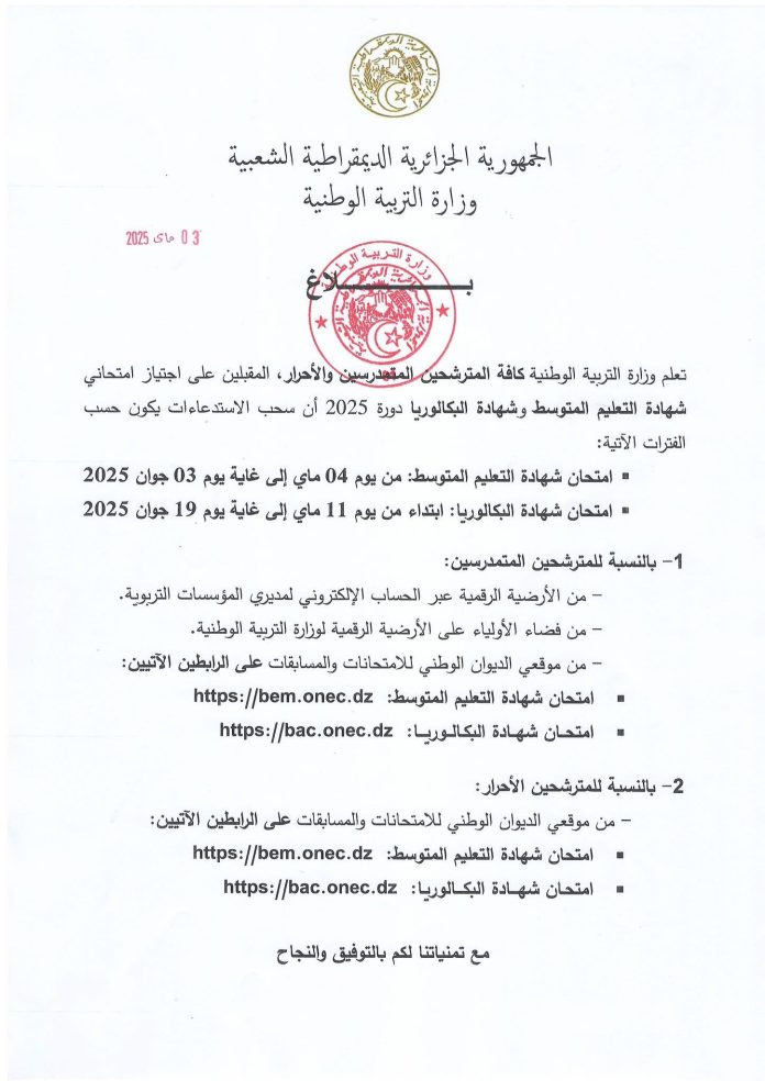 Le ministère de l’Education nationale a annoncé, hier, les dates de retrait des convocations pour les examens du Brevet de l’enseignement moyen (BEM) et du Baccalauréat. Pour le BEM, il sera possible de retirer sa convocation du 4 mai au 3 juin 2025. Quant au BAC, l’opération sera faisable du 11 mai au 19 juin 2025. Les candidats scolarisés pourront obtenir les convocations sur les plateformes des établissements ainsi que l’espace des parents d’élèves du ministère de l’Education nationale. Quant aux candidats libres, ils pourront télécharger leurs convocations sur le site de l’Office national des examens et des concours (ONEC).