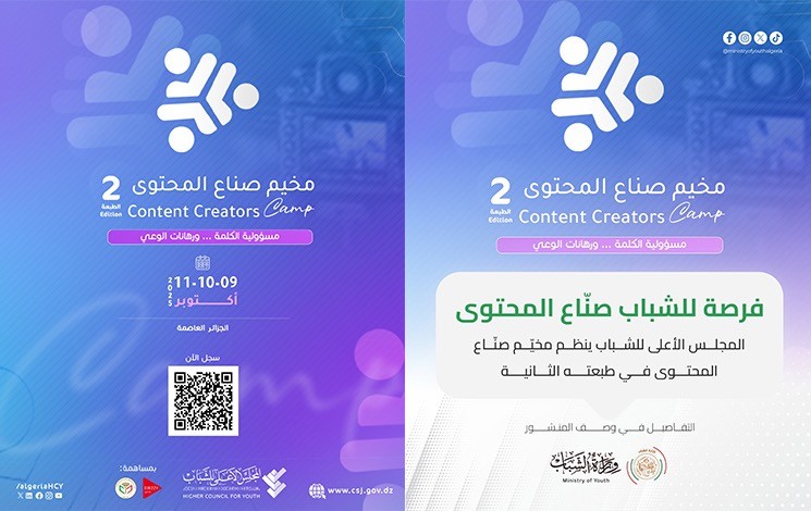 Le Conseil supérieur de la Jeunesse (CSJ) organise, du 9 au 11 octobre courant, la 2e édition du camp des créateurs de contenu. Cette édition du camp des créateurs de contenu, dont la 1ère édition a été organisée en 2023, est destinée aux jeunes passionnés par la création de contenu numérique, et vise à «réunir les décideurs avec les créateurs de contenu avec pour slogan vision et responsabilité». Les personnes intéressées et désirant participer à ce camp doivent s’inscrire, en remplissant le formulaire disponible via le lien suivant: https://portail.csj.gov.dz/apps/forms/s/MDzweYZf8WbjkdBXSGR9iD28, selon la même source.