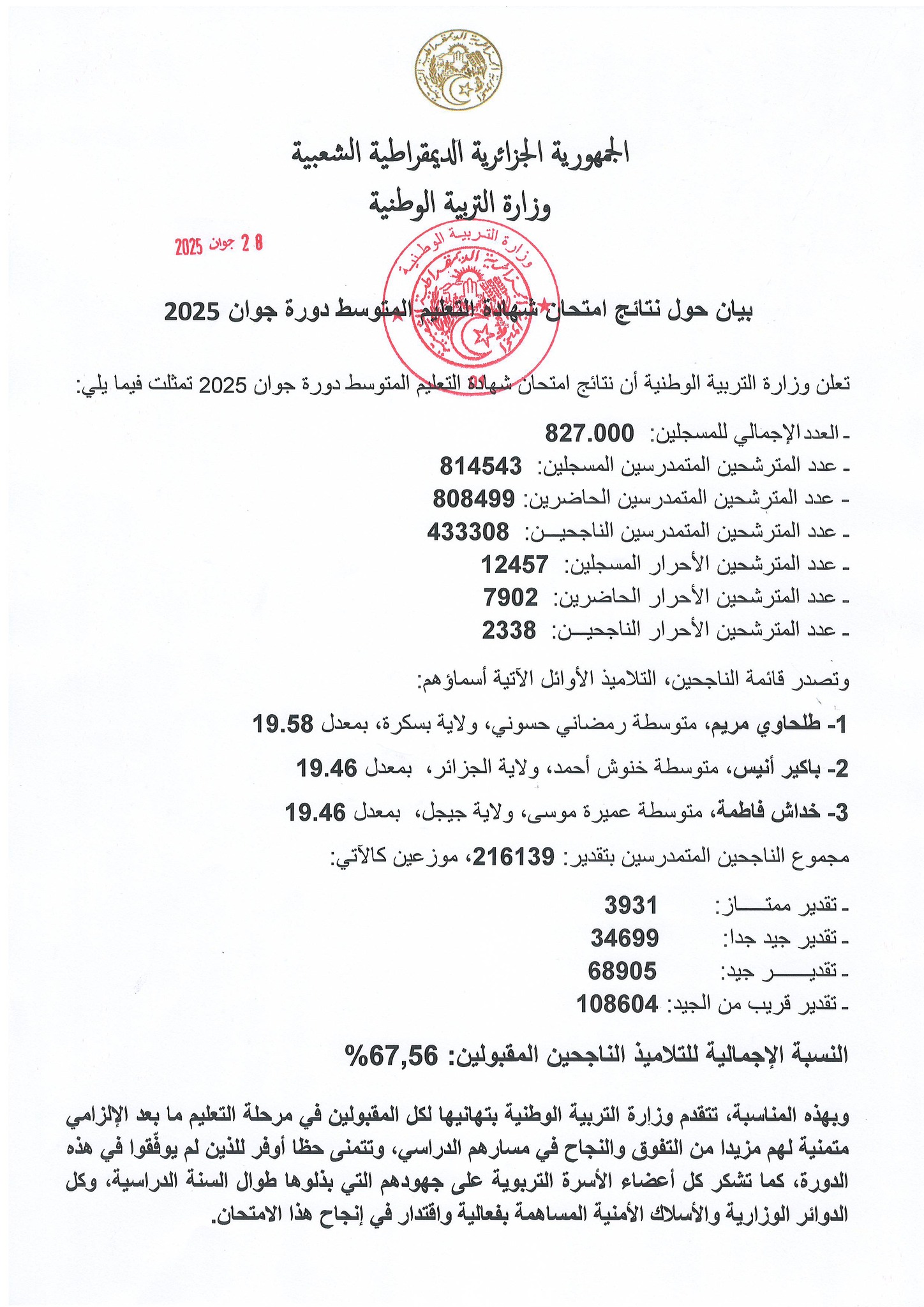 Le taux national de réussite à l’examen du Brevet d’enseignement moyen (BEM), session juin 2025, a atteint 67,56 %, a indiqué samedi un communiqué du ministère de l’Education nationale. Le nombre des candidats scolarisés admis s’élève à 433.308 élèves, celui des candidats libres admis à 2.338 élèves, précise la même source, rappelant que le nombre global des inscrits à cette session du BEM est de 827.000 candidats. Le nombre des candidats scolarisés inscrits s’élève 814.543 élèves, celui des candidats scolarisés présents aux examens à 808.499, celui des candidats libres inscrits à 12.457, alors que celui des candidats libres présents a atteint 7.902, ajoute le ministère. En tête de liste des lauréats figurent Talhaoui Meriem du CEM « Ramdani Hassouni » (Biskra) avec une moyenne de 19,58, suivie par Bakir Anis du CEM « Khennouche Ahmed » (Alger) avec une moyenne de 19,46, et Kheddache Fatima du CEM « Amira Moussa » (Jijel) avec une moyenne de 19,46, lit-on dans le communiqué.