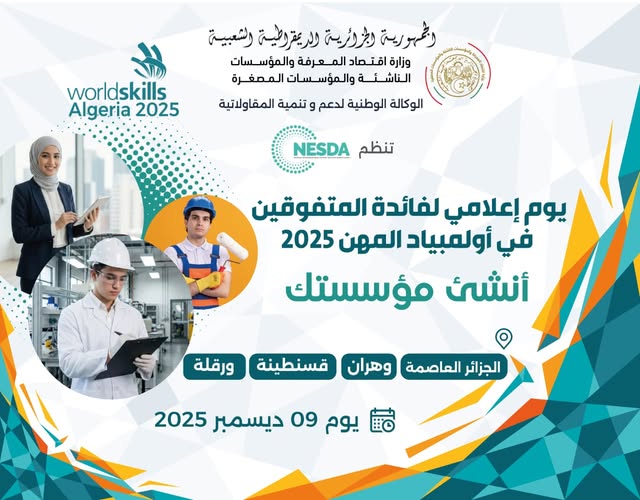 L’Agence nationale de soutien et de développement de l’entrepreneuriat (Nesda) a annoncé l’organisation, mardi à Alger, d’une journée d’information dédiée aux lauréats des Olympiades des métiers « Skills Olympics 2025 ». L’événement se tiendra à la Bibliothèque nationale d’El Hamma et aura pour objectif de soutenir les jeunes talents distingués lors de cette compétition nationale, en leur offrant une meilleure connaissance des dispositifs d’accompagnement et de création d’entreprises.