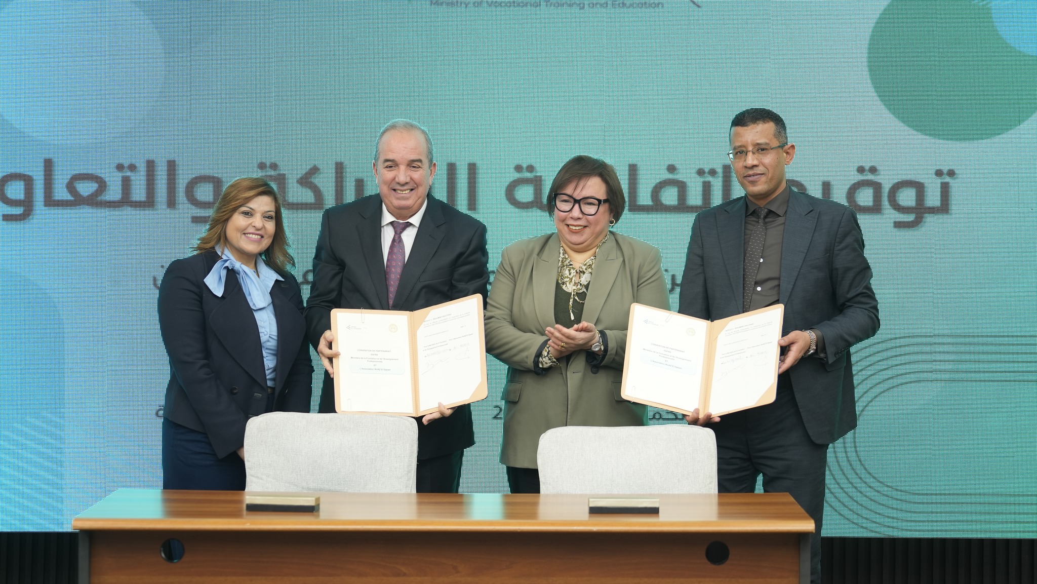 Cet accord vise à renforcer la culture de la contractualisation et à améliorer les capacités des jeunes au sein du système de formation professionnelle, à travers l’intégration de la dimension contractuelle dans les parcours formatifs. Il prévoit le lancement du Programme Entrepreneuriat ainsi que des programmes VEC – Célébration de l’Entrepreneuriat Professionnel, combinant formation théorique, accompagnement appliqué et développement des compétences comportementales et professionnelles, en vue de permettre la création de mini-projets susceptibles d’être concrètement mis en œuvre. Dans sa première phase, le programme mobilise plus de 200 espaces, répartis sur 22 équipes, à travers 22 centres de formation contractuels ainsi qu’un établissement de formation, couvrant l’ensemble du territoire national. Il comprend également l’organisation d’ateliers de formation au profit des enseignants et des encadreurs, afin de garantir un encadrement de qualité et d’unifier les approches pédagogiques. Le programme prévoit une extension progressive à partir de 2027, avec l’intégration de 50 à 100 centres de développement de l’alphabétisation et d’institutions de formation, en prélude à une généralisation à l’échelle nationale durant la période 2028-2030. À cette occasion, la ministre a affirmé que cette convention constitue une avancée qualitative vers l’incubation d’espaces dédiés aux idées innovantes, le renforcement de l’inclusion des jeunes dans l’économie nationale et la contribution à la création de richesses et d’emplois, à travers une formation professionnelle davantage connectée aux réalités économiques et aux exigences du marché.