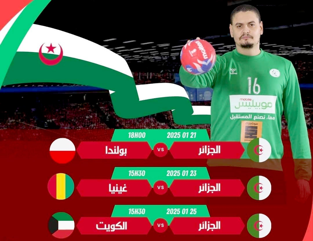 Voici le programme de la sélection algérienne de handball dans le cadre de la Coupe du président (matchs de classement) des Championnats du monde handball 2025, prévue au Porec Zatica Arena en Croatie. Matchs de classement (heures algériennes) : Mardi 21 janvier (18h00) : Algérie-Pologne Jeudi 23 janvier (15h30) : Algérie-Guinée Samedi 25 janvier (15h30) : Algérie-Koweït Versé dans le groupe B du Tour préliminaire, le Sept national a concédé trois défaites face au Danemark (22-47), l’Italie (23-32) et la Tunisie (26-25) et s’est classé 4e de son groupe. Pour rappel, les trois premières équipes de chaque groupe se qualifient au tour principal.