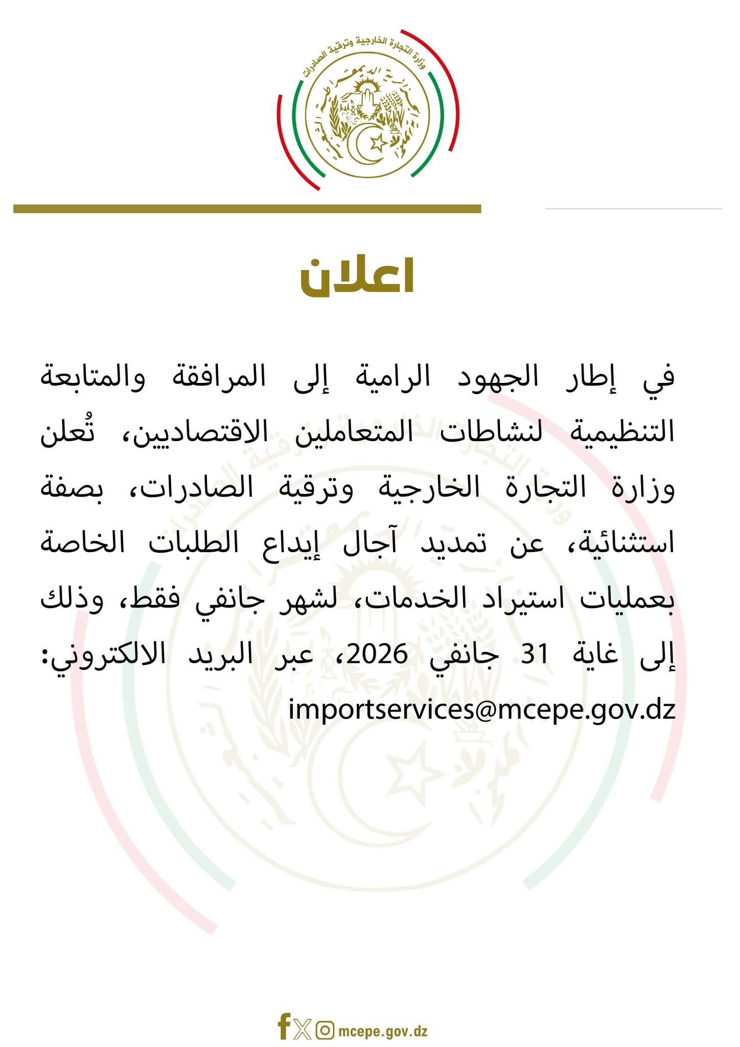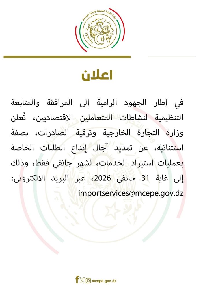 « Le ministère du Commerce extérieur et de la Promotion des exportations annonce, à titre exceptionnel, la prolongation des délais de dépôt des demandes relatives aux opérations d’importation de services jusqu’au 31 janvier 2026″, et ce via l’adresse électronique: importservices@mcepe.dz », lit-on dans le communiqué. Cette mesure s’inscrit dans le cadre des efforts déployés en vue d’assurer l’accompagnement et le suivi organisationnel des activités des opérateurs économiques, ajoute la même source.