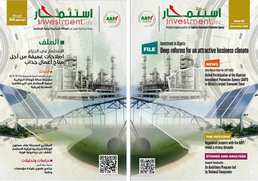 À travers cette initiative éditoriale, l’AAPI ambitionne de renforcer l’attractivité du climat des affaires national et d’accompagner les réformes structurelles engagées par l’Algérie. La revue se veut un espace d’information, d’analyse et de mise en perspective des politiques publiques et des dynamiques économiques liées à l’investissement, tant au niveau national qu’international. Ce premier numéro met en lumière les réformes juridiques et économiques visant l’amélioration de l’environnement des affaires, ainsi que les incitations et avantages accordés aux projets d’investissement. Il souligne également le rôle central de l’Agence algérienne de promotion de l’investissement et de la Commission supérieure de recours dans la protection des droits des investisseurs, le renforcement de la transparence et la consolidation de la confiance. La publication revient par ailleurs sur plusieurs événements économiques internationaux majeurs, dont la participation de l’Algérie à la Foire commerciale intra-africaine IATF 2025, ainsi que sur l’élection de l’AAPI au poste de directeur régional pour la région MENA au sein de l’Association des agences de promotion de l’investissement. Elle met également en avant des partenariats économiques et des projets stratégiques couvrant plusieurs secteurs d’activité. Le numéro comprend en outre des analyses approfondies et des études consacrées aux opportunités d’investissement durable, à la sécurité alimentaire et hydrique, ainsi qu’au développement des chaînes de valeur nationales, reflétant les orientations de l’Algérie en matière de diversification économique et de développement durable. Publiée en versions papier et numérique, la revue « Investir.Dz » entend devenir une référence médiatique facilitant la communication entre investisseurs, institutions et acteurs économiques, tout en soutenant les objectifs de croissance et de développement économique durable du pays. L’Agence algérienne de promotion de l’investissement invite, par ailleurs, les lecteurs et les professionnels à consulter la version électronique du numéro pilote et se dit ouverte aux propositions et contributions, dans une démarche participative visant à enrichir le contenu de cette nouvelle publication institutionnelle.
