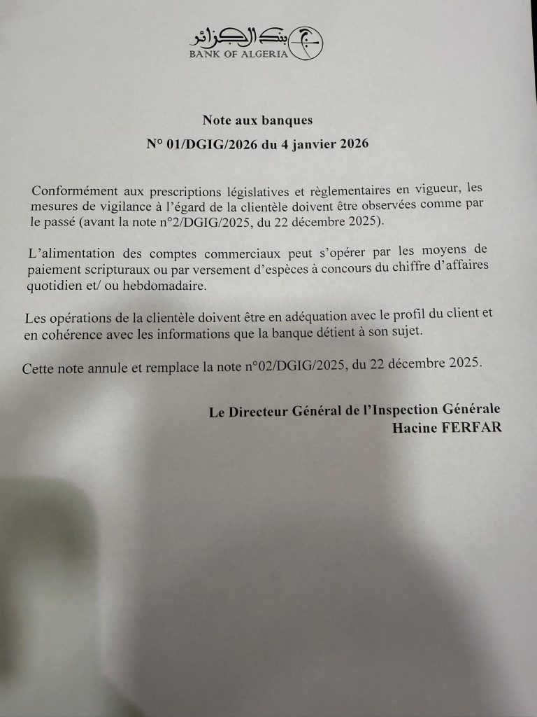 « Conformément aux prescriptions législatives et règlementaires en vigueur, les mesures de vigilance à l’égard de la clientèle doivent être observées comme par le passé (avant la note N 02/DGIG/2025, du 22 décembre 2025) », lit-on dans la note.