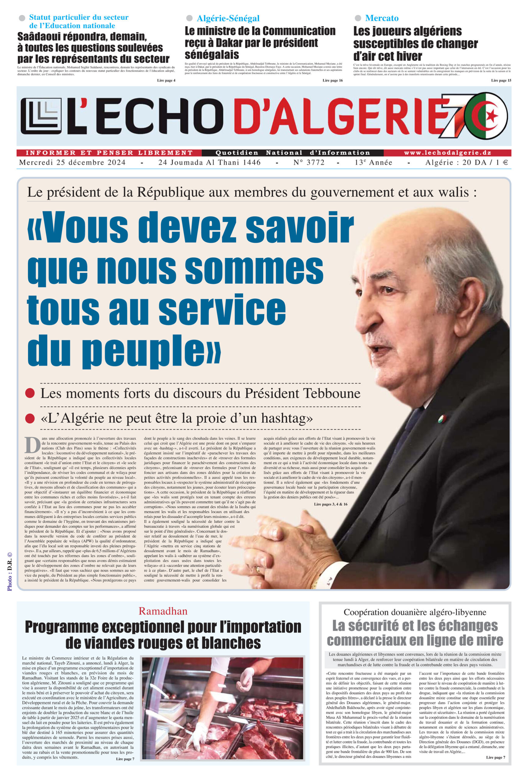 L’Echo d’Algérie, Quotidien National d’Information édité par Echo Médias Algérie Sarl, venu enrichir la presse écrite, jeune par son âge certes mais en réalité c’est le prolongement d’un idéal, d’un combat, d’un rêve.
