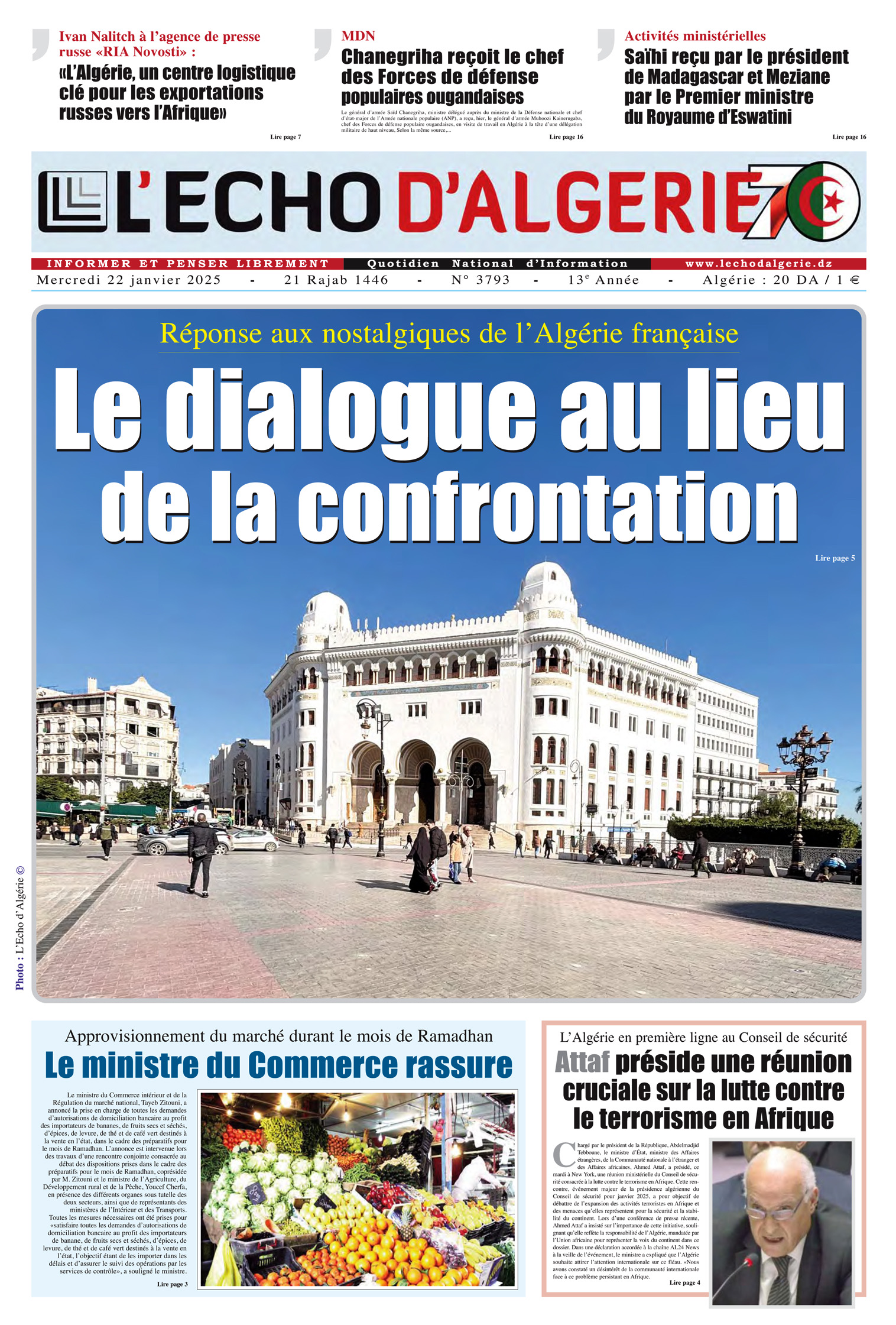 L’Echo d’Algérie, Quotidien National d’Information édité par Echo Médias Algérie Sarl, venu enrichir la presse écrite, jeune par son âge certes mais en réalité c’est le prolongement d’un idéal, d’un combat, d’un rêve.