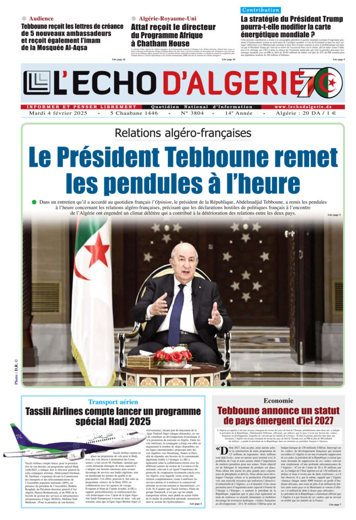 L’Echo d’Algérie, Quotidien National d’Information édité par Echo Médias Algérie Sarl, venu enrichir la presse écrite, jeune par son âge certes mais en réalité c’est le prolongement d’un idéal, d’un combat, d’un rêve.