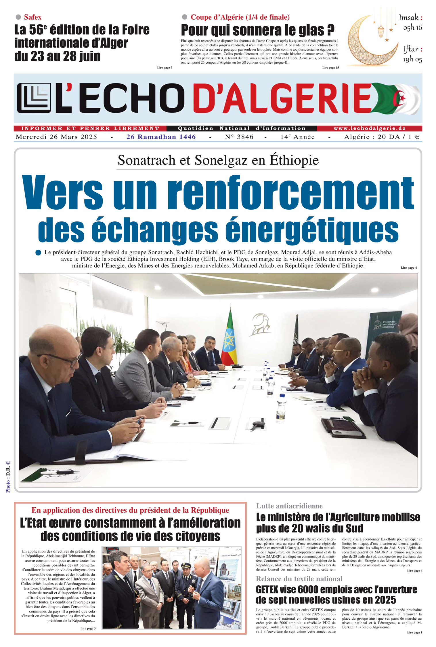 L’Echo d’Algérie, Quotidien National d’Information édité par Echo Médias Algérie Sarl, venu enrichir la presse écrite, jeune par son âge certes mais en réalité c’est le prolongement d’un idéal, d’un combat, d’un rêve.