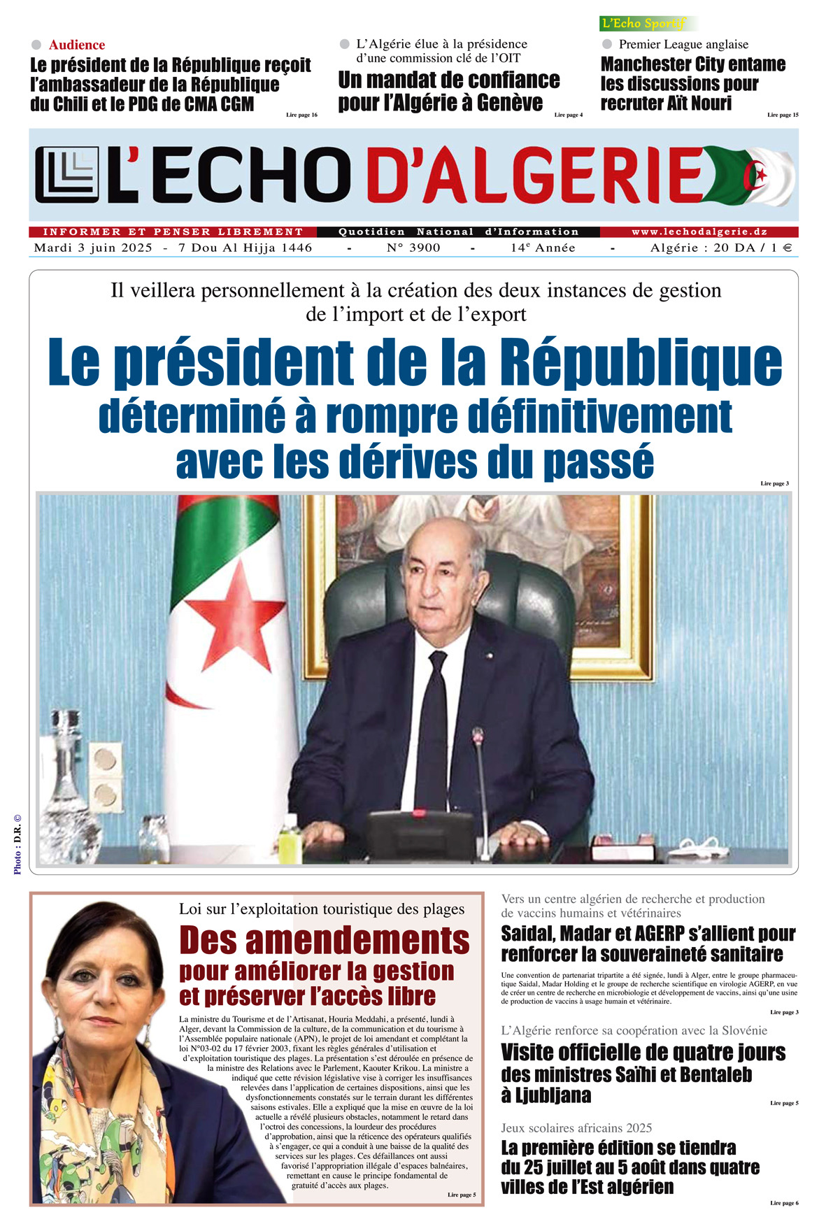 L’Echo d’Algérie, Quotidien National d’Information édité par Echo Médias Algérie Sarl, venu enrichir la presse écrite, jeune par son âge certes mais en réalité c’est le prolongement d’un idéal, d’un combat, d’un rêve.
