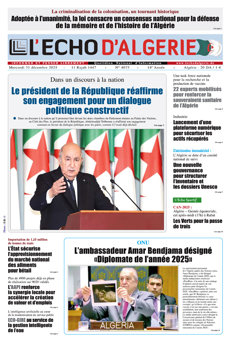 L’Echo d’Algérie, Quotidien National d’Information édité par Echo Médias Algérie Sarl, venu enrichir la presse écrite, jeune par son âge certes mais en réalité c’est le prolongement d’un idéal, d’un combat, d’un rêve.