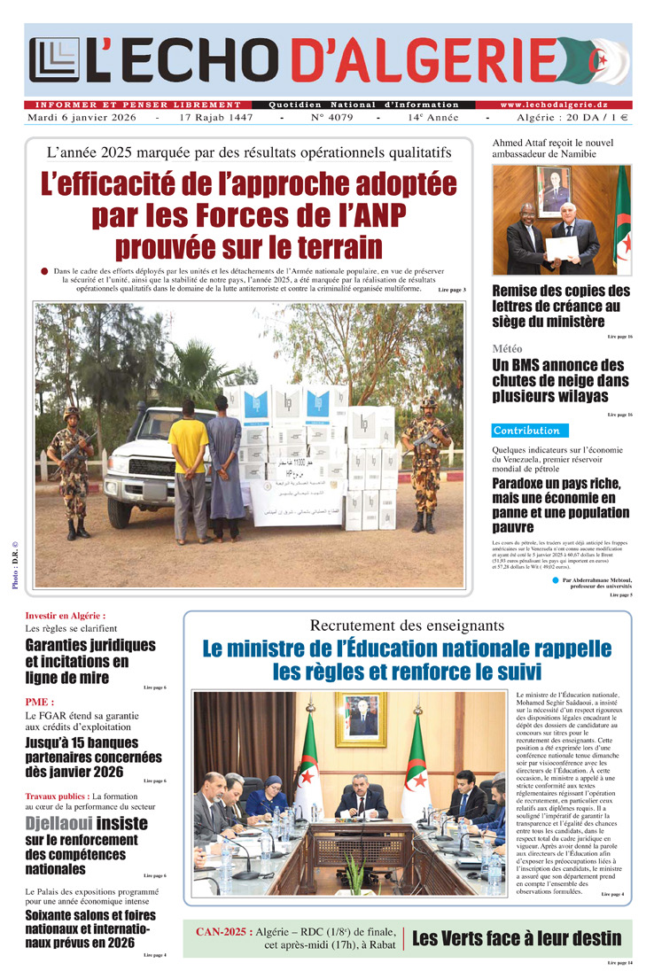 L’Echo d’Algérie, Quotidien National d’Information édité par Echo Médias Algérie Sarl, venu enrichir la presse écrite, jeune par son âge certes mais en réalité c’est le prolongement d’un idéal, d’un combat, d’un rêve.