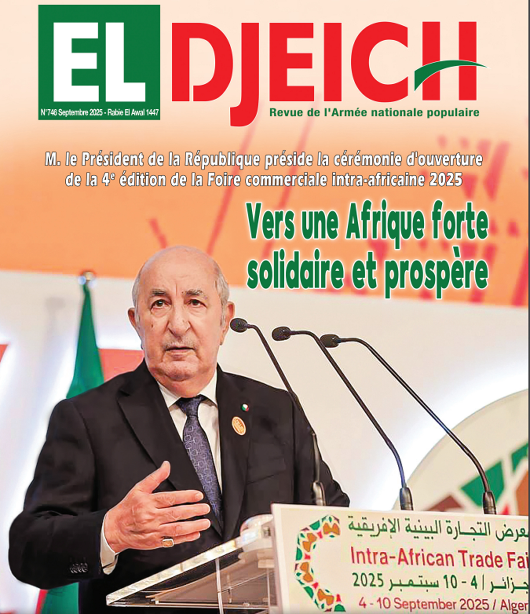 Le numéro 746 du magazine de l’Armée nationale populaire (El Djeïch), paru en ce mois de septembre, s’ouvre sur un éditorial intitulé « Pour un continent sûr, stable et prospère », mettant en avant le rôle central de l’Algérie dans la promotion de l’intégration africaine et le développement du continent.