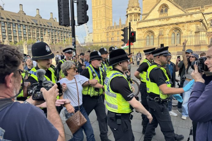 La police de la capitale britannique a déclaré avoir procédé à 212 arrestations de personnes âgées de 27 à 82 ans. Entre 300 et 400 personnes s’étaient retrouvées à la mi-journée à Trafalgar Square pour un rassemblement silencieux, une sorte de sit-in pacifique, au cours duquel beaucoup arboraient la pancarte proscrite « Je m’oppose au génocide, je soutiens Palestine Action ».