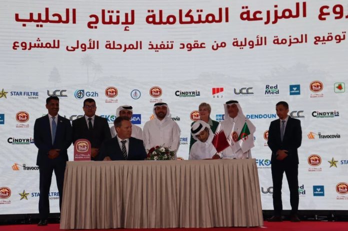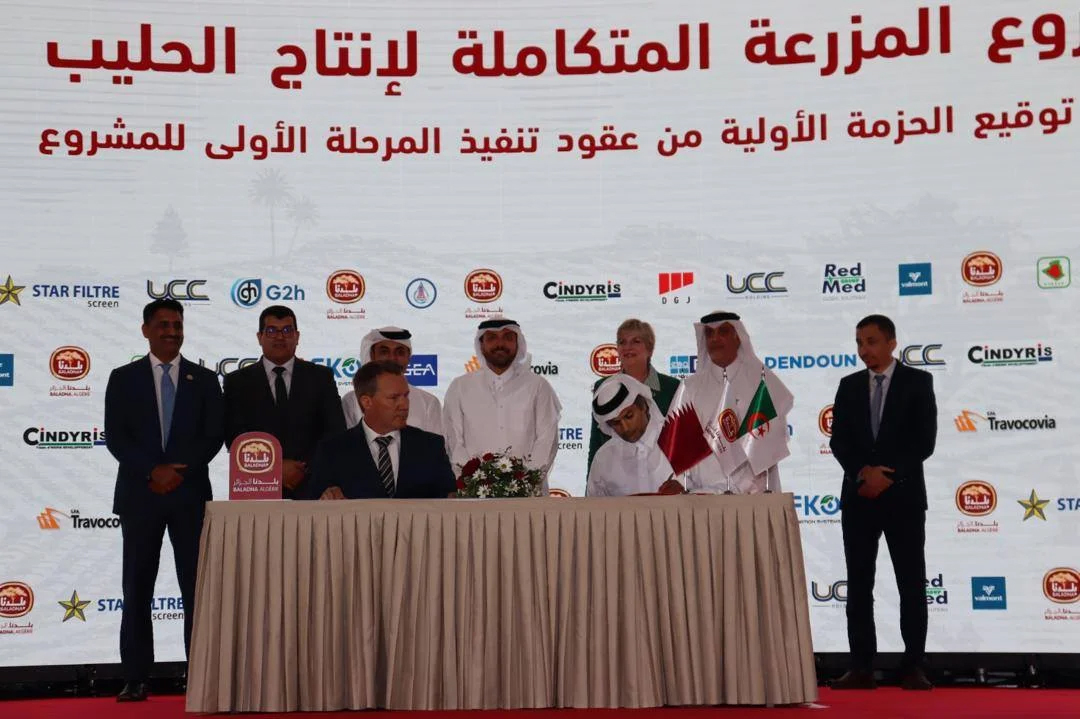Au total, quatorze contrats ont été conclus avec des entreprises de renommée internationale spécialisées dans les domaines des technologies agricoles, de l’irrigation, du forage, des équipements industriels et des études techniques et environnementales. Parmi elles figure l’allemande GEA Technologies, leader dans les lignes de production laitières, qui concevra l’usine de lait en poudre et les fermes bovines. L’unité de séchage atteindra 40 mètres de hauteur. La société UCC – UrbaCon Trading and Contracting réalisera la charpente métallique de l’usine, et EHAF (Qatar) prendra en charge l’élaboration des plans architecturaux du projet. AFKO (Turquie) et Valmont (États-Unis) fourniront des systèmes d’irrigation adaptés aux conditions climatiques locales. La coordination générale du projet a été confiée à la société DG Jones and Partners, tandis que DANDOUN et CINDYRIS interviendront sur les études techniques. EFORHYD, une société algérienne, sera chargée du forage des puits, en collaboration avec GÉNIE HUDRIQUE et STAR FILTRE, qui fourniront les tubes de tubage. Les infrastructures d’accueil seront réalisées par RedMed (base de vie principale) et Condor-Travocovia (deuxième base de vie). Le BNEDER pilotera les études techniques rurales nécessaires. La première phase du projet prévoit la mise en valeur de 100.000 hectares, l’installation de 700 pivots d’irrigation, la création de deux fermes bovines, et la construction d’une usine de production de lait en poudre. Le lancement de la production est prévu pour 2026, avec l’importation de vaches laitières à haut rendement, sélectionnées selon les standards internationaux. Présent lors de la cérémonie, le ministre de l’Agriculture, Youcef Cherfa, a salué un projet structurant pour la sécurité alimentaire nationale, en soulignant l’octroi du foncier, les autorisations de forage, le raccordement aux réseaux et l’achèvement des infrastructures essentielles. Le directeur général de l’Agence algérienne de promotion de l’investissement (AAPI), Omar Rekkache, a estimé que cette signature concrétise la nouvelle politique de l’Algérie en matière d’investissement productif. Mohamed Moutaz Al-Khayyat, président du conseil d’administration de Baladna, a, quant à lui, insisté sur l’engagement à respecter les délais et les standards internationaux. L’ambassadeur du Qatar, Abdulaziz Ali Al-Naama, a salué l’accélération de la coopération bilatérale et l’ambition partagée de répondre aux défis de la sécurité alimentaire. Ce projet, qui s’étend sur 117.000 hectares, ambitionne de couvrir 50 % des besoins algériens en poudre de lait et de créer plus de 5.000 emplois directs. La cérémonie s’est tenue en présence de plusieurs membres du gouvernement, de représentants diplomatiques, d’investisseurs algériens et étrangers ainsi que de banques publiques.
