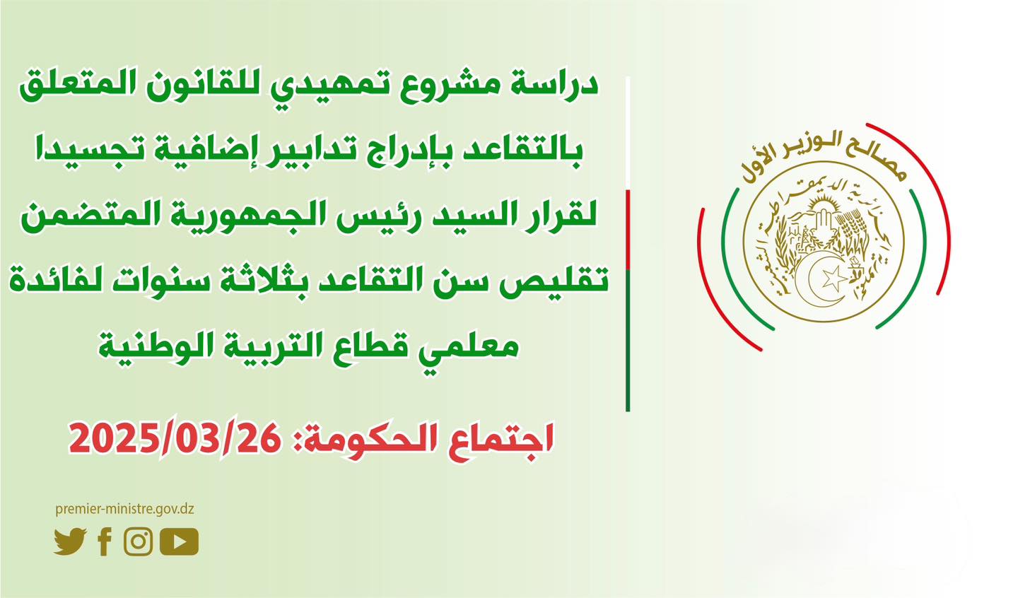 Le gouvernement a également examiné un avant-projet de loi modifiant et complétant la loi n° 83-12 du 2 juillet 1983 relative à la retraite. Cette réforme vise à concrétiser la décision du Président de la République de réduire de trois ans l’âge de départ à la retraite pour les enseignants du secteur de l’éducation nationale, en prenant en compte tous les aspects liés à cette mesure.