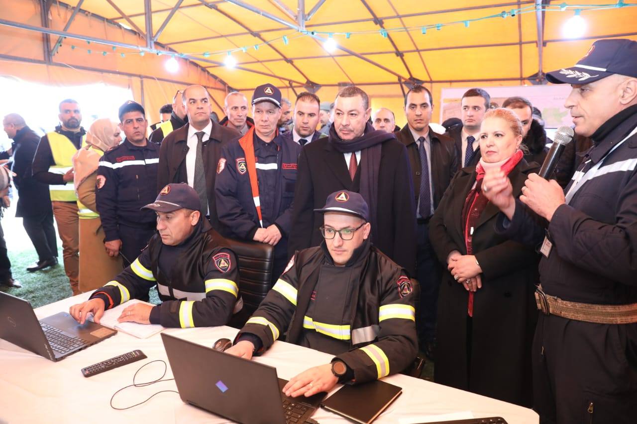 Lors de cette visite, le ministre a effectué une tournée sur le terrain comprenant plusieurs étapes opérationnelles et organisationnelles, débutant par la visite de la direction de coordination de l’exercice, où il a pris connaissance du déroulement des opérations et des mécanismes de suivi et d’exécution du scénario de la manœuvre. La visite a également inclus le centre de commandement central, où des explications détaillées ont été présentées concernant le système de commandement et de contrôle, ainsi que les méthodes de coordination entre les différents centres de commandement sectoriels, garantissant la rapidité de prise de décision et l’efficacité de l’intervention. À cette même occasion, la cellule d’information a été visitée, permettant de prendre connaissance des mécanismes de couverture médiatique adoptés, assurant la fluidité de l’information et renforçant la communication institutionnelle durant le déroulement de la manœuvre. La tournée a également compris le centre vétérinaire avancé dédié au suivi de l’état de santé des chiens de l’unité cynotechnique, où le ministre s’est informé des procédures mises en place pour garantir leur préparation opérationnelle lors des différentes phases de la manœuvre, dans le cadre de la préservation de la sécurité des moyens mobilisés pour l’intervention. Le ministre a également inspecté certaines équipes de soutien et d’intervention initiale, s’informant de leur état de préparation opérationnelle, du niveau d’équipement et de la coordination sur le terrain mobilisée pour faire face aux différentes situations d’urgence inscrites dans le scénario de la manœuvre. Dans le même contexte, le ministre a examiné les centres de commandement sectoriels et pris connaissance de leur fonctionnement, des mécanismes de prise de décision et de coordination opérationnelle avec le centre de commandement central, garantissant l’efficacité et la cohérence dans la gestion du déroulement de la manœuvre. Enfin, le ministre a inspecté les zones de déploiement des différentes équipes et spécialités, où il a pris connaissance de leur organisation sur le terrain, de la disponibilité des moyens humains et matériels mobilisés, ainsi que du niveau de coordination entre les différentes spécialités, garantissant l’efficacité de l’intervention et la rapidité de réponse durant le déroulement de la manœuvre. À cette occasion, le ministre de l’Intérieur, des Collectivités locales et des Transports a exprimé ses remerciements et sa reconnaissance aux agents de la Protection civile pour les efforts déployés et les résultats positifs obtenus, saluant le haut niveau de professionnalisme et l’esprit de responsabilité dont ils ont fait preuve dans l’accomplissement de leurs nobles missions, tout en réaffirmant son soutien continu au corps de la Protection civile.