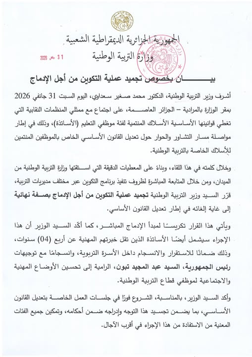 Cette rencontre a réuni les syndicats dont les statuts couvrent les différentes catégories du personnel enseignant. Elle s’inscrit dans une démarche de concertation visant à adapter le cadre réglementaire aux réalités du terrain et aux attentes exprimées par les acteurs du secteur. À cette occasion, le ministre a annoncé le gel de la formation liée à l’intégration, en vue de son annulation définitive dans le cadre de la révision du statut particulier. Cette décision repose, selon le communiqué, sur des données précises collectées par le ministère à travers des enquêtes de terrain et un suivi direct de la mise en œuvre des programmes de formation au niveau des directions de l’éducation. M. Sadaoui a précisé que cette mesure consacre désormais le principe de l’intégration directe. Elle concernera également les enseignants justifiant de moins de quatre années d’expérience professionnelle, dans un souci de consolidation de la stabilité et de la cohésion au sein de la communauté éducative.