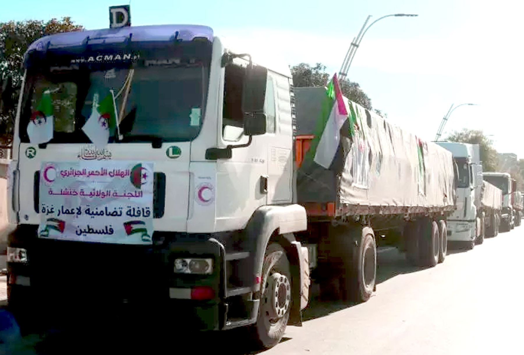 Une caravane de solidarité chargée de 54 tonnes d’aide humanitaire destinée à la population de Ghaza, en Palestine occupée, s’est ébranlée, dimanche, de Khenchela Le wali, Salim Harizi, a donné le signal de départ cette caravane, initiée par la délégation de wilaya du Croissant-Rouge algérien (CRA), et comprenant 54 tonnes de denrées alimentaires, de médicaments, de matelas, de couvertures, de vêtements et autres, transportés à bord de 4 grands camions. Cette initiative s’inscrit dans le cadre de la solidarité agissante de l’Algérie avec les populations meurtries de la bande de Ghaza qui font face à une situation des plus difficiles en raison de l’agression sioniste, a déclaré Fateh Maarouf, président de la délégation locale du CRA. La caravane, qui a pris la route devant le siège de la wilaya de Khenchela, doit se rendre au centre national de collecte des aides destinées au peuple palestinien situé dans la zone industrielle de Blida, avant d’être acheminée vers ses destinataires en Palestine depuis l’aéroport militaire de Boufarik. M. Maarouf a ajout é que les aides collectées à Khenchela proviennent d’opérateurs économiques, d’industriels, de bienfaiteurs, d’associations en coordination avec les directions du commerce, de l’industrie et de l’action sociale.