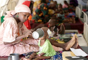 «Les nouveaux chiffres recueillis par Save The Children révèlent que la moitié des enfants de moins de 5 ans souffrent de malnutrition aigüe», réfugiés dans les districts du Nord-Est du Nigeria où l’ONG peut travailler. «Les chiffres pourraient être pires dans les régions qui sont toujours inaccessibles à cause de l’insécurité», a annoncé l’ONG dans un communiqué, calculant que «200 enfants pourraient être en train de mourir de faim chaque jour», notamment parmi les 2,6 millions de déplacés du conflit. Ben Foot, directeur de Save the Children au Nigeria, a visité un centre de santé dans la périphérie de Maiduguri, capitale de l’Etat du Borno (Nord) où 1,5 millions de personnes ont trouvé refuge, suite au conflit entre l’armée et le groupe extrémiste Boko Haram. «Notre unité intensive est déjà en sur-capacité, et les enfants sévèrement touchés par la malnutrition doivent être traités à même le sol sur des matelas», a déclaré B. Foot. «Bientôt, a-t-il dit, nous serons dans l’incapacité de nous occuper des enfants mourant de faim». Le 1er juillet, l’Unicef avait prévenu que 250 000 enfants de moins de cinq ans, premières victimes d’un manque d’alimentation, allaient souffrir de malnutrition sévère extrême dans l’Etat du Borno cette année, dont 50 000 risquant même de mourir si rien n’est fait. Ce chiffre est désormais monté à 75 000.